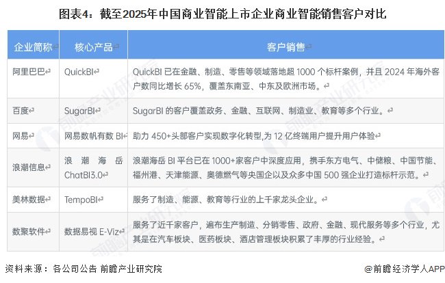 阿里巴巴QuickBI、百度SugarBI、网易数帆有数BI、浪潮信息浪潮海岳ChatBI3.0、美林数据TempoBI、数聚软件数据易视E-Viz,核心产品分别覆盖金融、政务、头部企业、央国企、龙头企业及多行业客户,且在海外市场、汽车医药等细分领域各有突破。